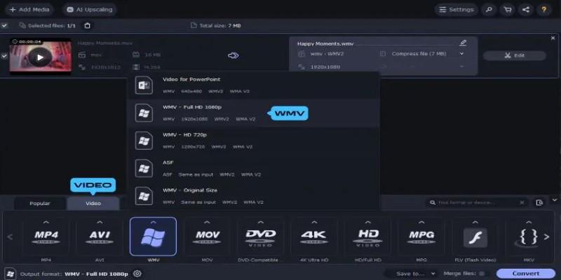 At the bottom of the window, choose “WMV” from the list of formats. You can adjust the output quality here—higher resolutions make larger files. Hit the “Convert” button and wait. The conversion time depends on the file size and your PC, but for a short animation, it usually takes less than a minute.